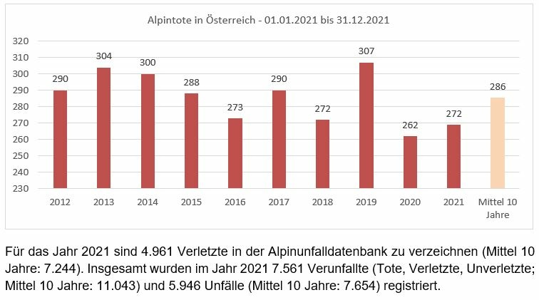 Wie aus der Alpinunfallstatistik des Österreichischen Kuratoriums für Alpine Sicherheit (ÖKAS) / BMI Alpinpolizei hervorgeht, sind im Jahr 2021 zwischen 1. Januar und 31. Dezember 272 Menschen in Österreichs Bergen ums Leben gekommen. Das langfristige Mittel liegt bei 286 Toten pro Jahr. Im Jahr 2021 sind 43 Frauen (16%) und 229 Männer (84%) am Berg tödlich verunglückt.
