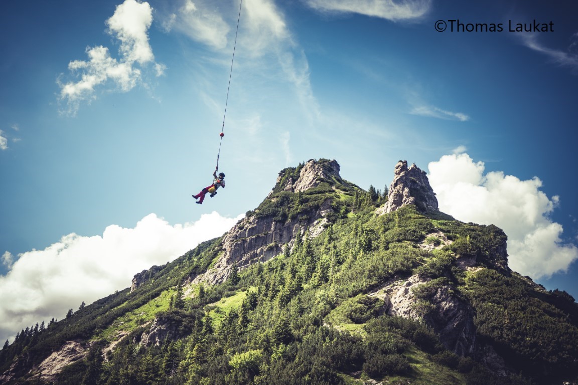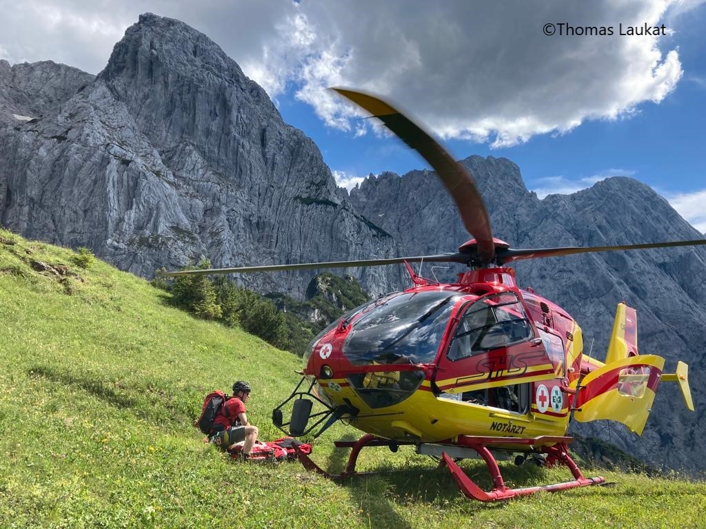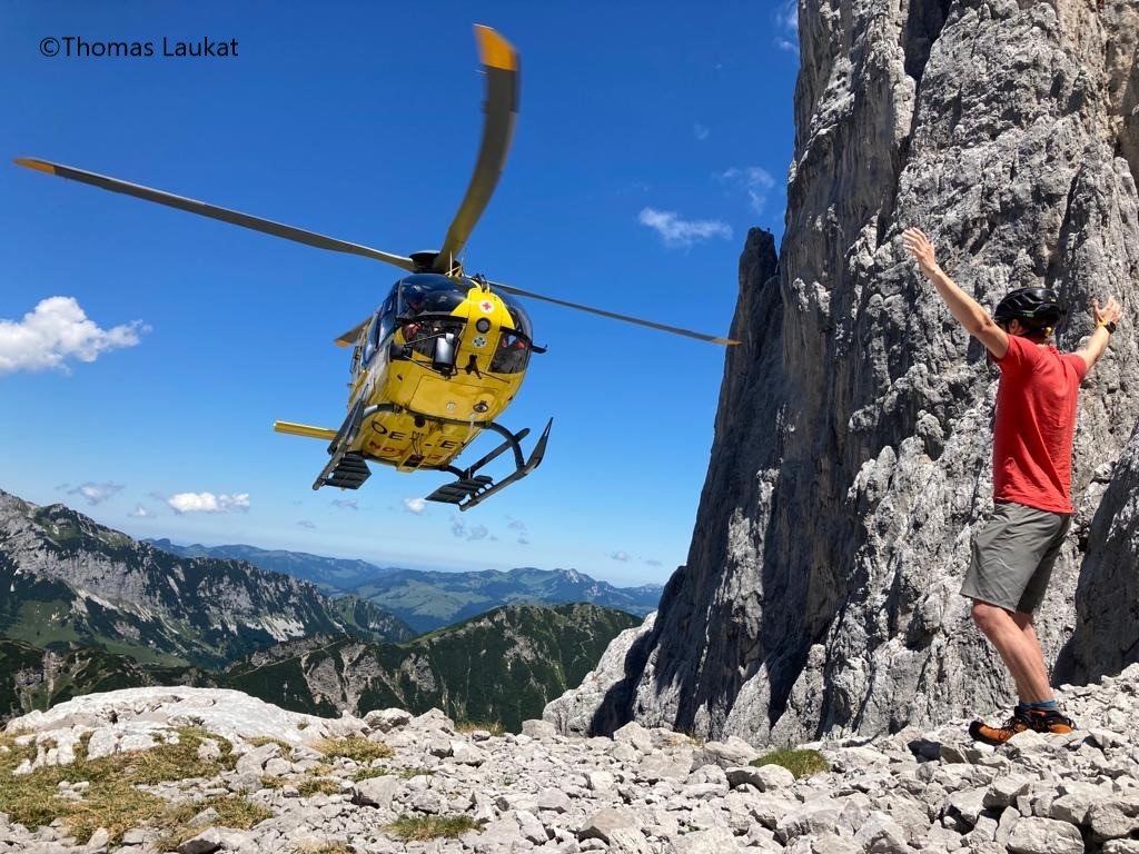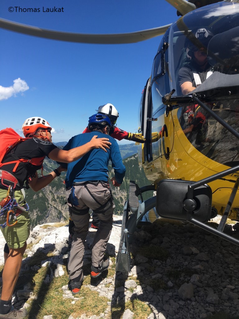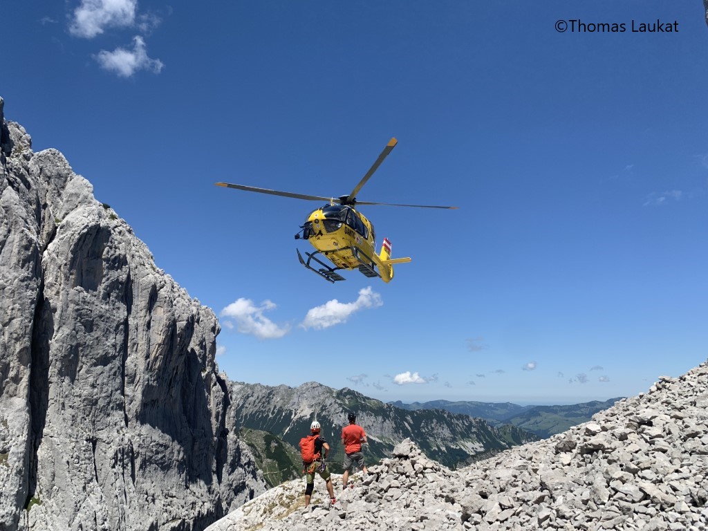 Zu dieser Zeit meldete sich die Leitstelle mit einer weiteren Meldung. Über die Polizeileitstelle Erpfendorf sei ein Notruf von der gleichen Stelle eingegangen. Der sich im Anflug befindende Notarzthubschrauber Christopherus 4 wurde daraufhin um einen Aufklärungsflug im fraglichen Gebiet gebeten. Tatsächlich war einem Kletterer nur ein paar hundert Meter über dem ersten Verletzten ein Stein ausgebrochen und hatte ihn am Fußverletzt. Da der erste Patient, abgesehen von den Händen, wohlauf war, wurde entschieden, den zweiten Verletzten zuerst per Taubergung aus der Wand zu retten. Danach konnte unser Patient nach einer eindrucksvollen Landung auf einem kleinen Felsplateau aufgenommen werden und die beiden Verletzten wurden ins KH St. Johann verbracht.