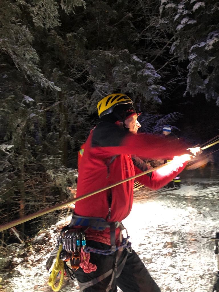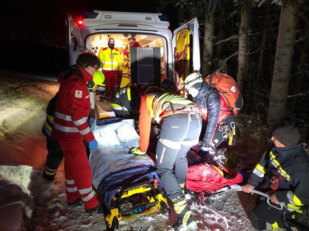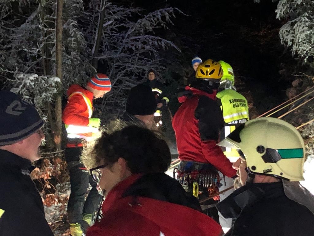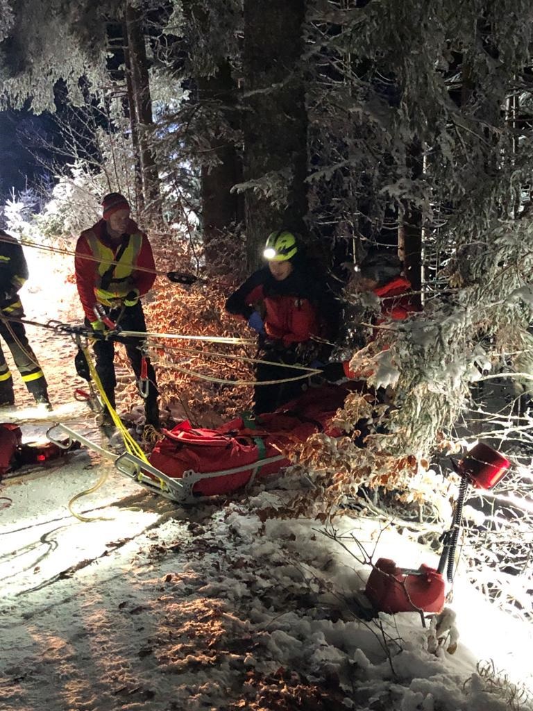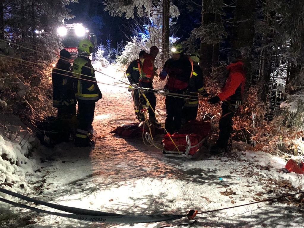 Ein Mann rutschte auf dem verschneiten Weg so unglücklich aus, dass er in den steilen Wald und gleich noch über eine Felsstufe etliche Meter hinabstürzte. Dort blieb er verletzt liegen. Dunkelheit und eisige Kälte verschärften die Situation.
