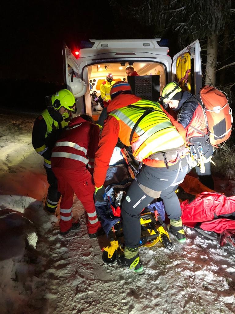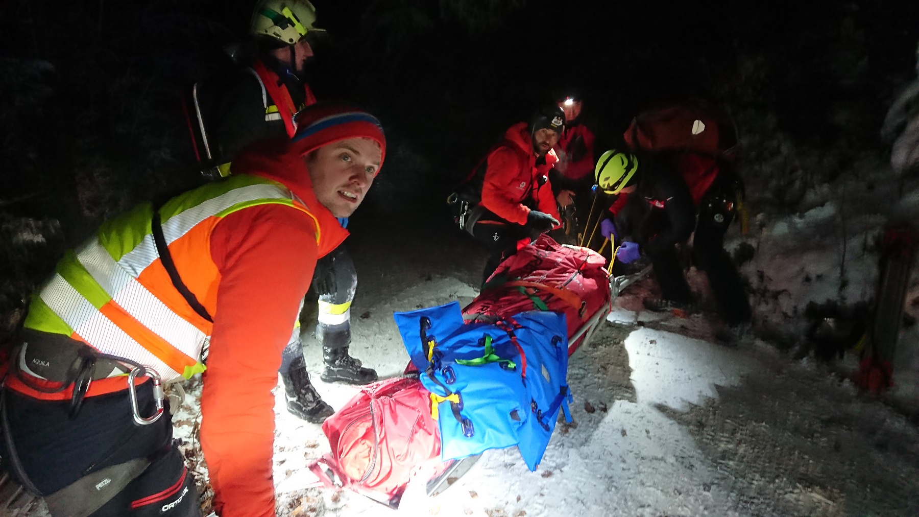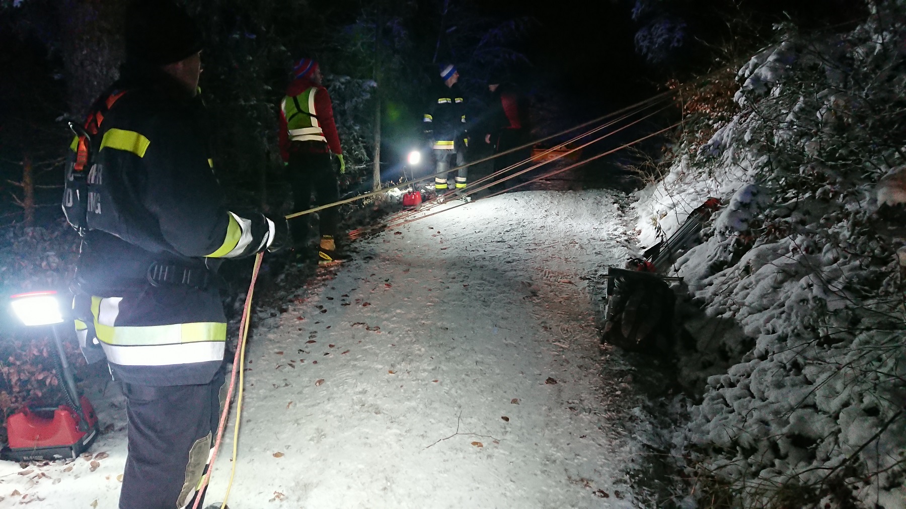 Ein Mann rutschte auf dem verschneiten Weg so unglücklich aus, dass er in den steilen Wald und gleich noch über eine Felsstufe etliche Meter hinabstürzte. Dort blieb er verletzt liegen. Dunkelheit und eisige Kälte verschärften die Situation.