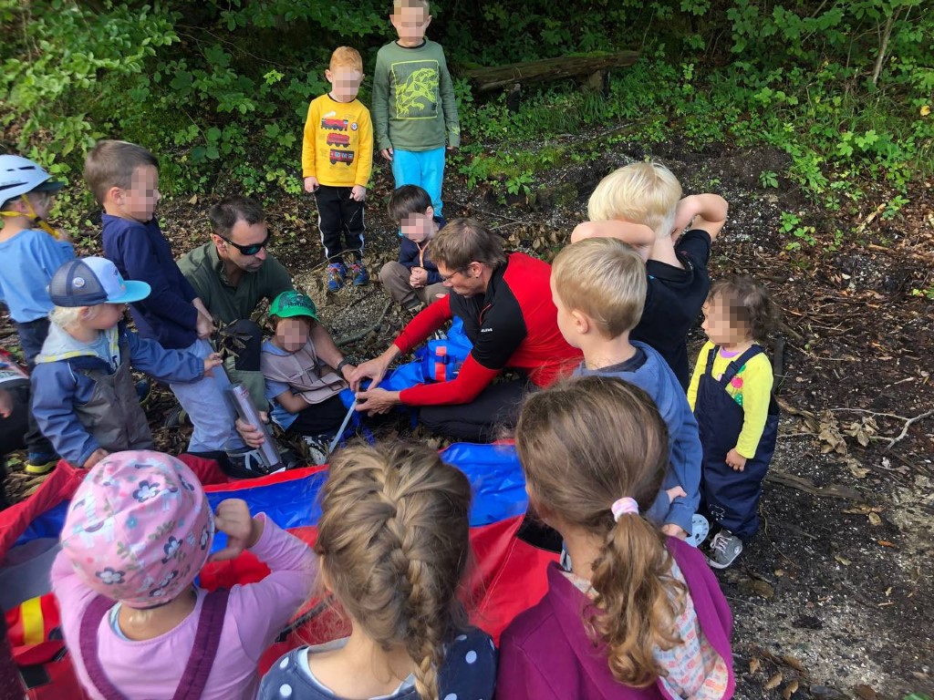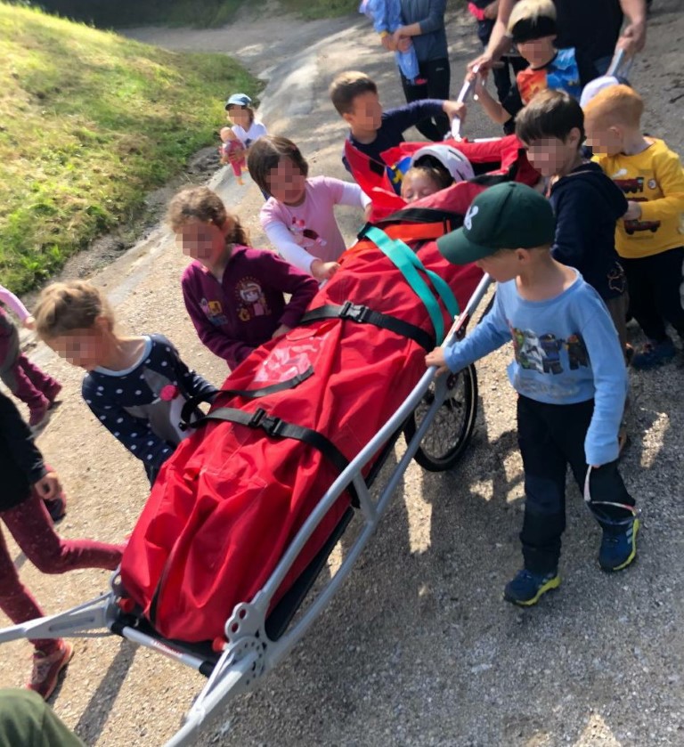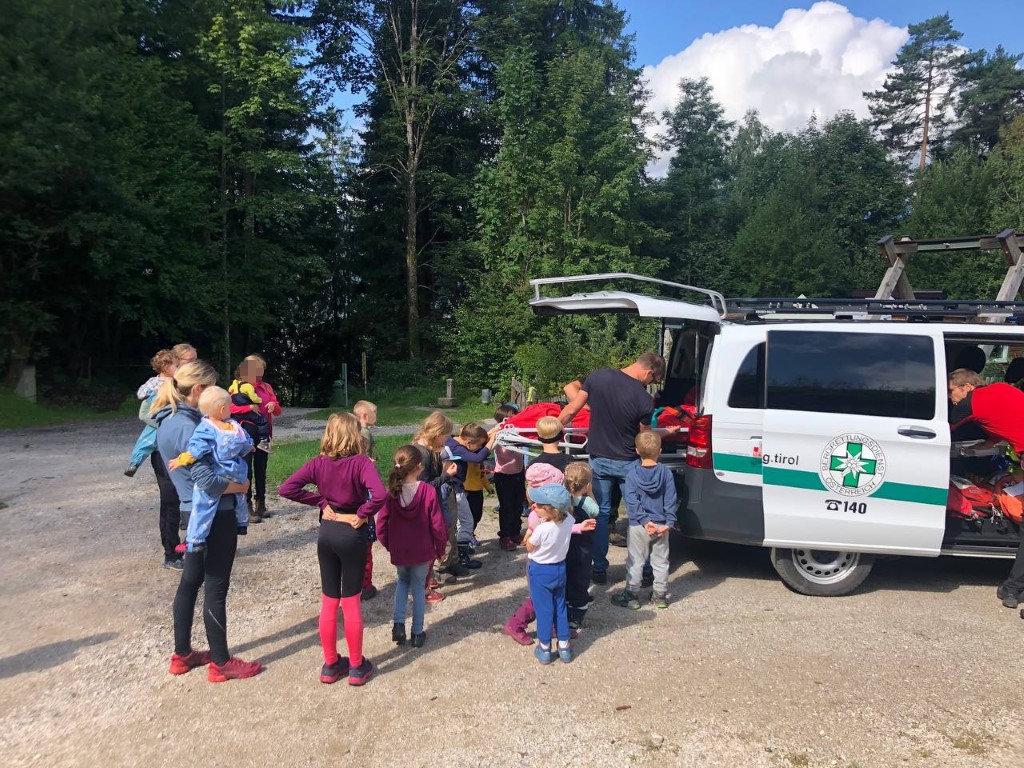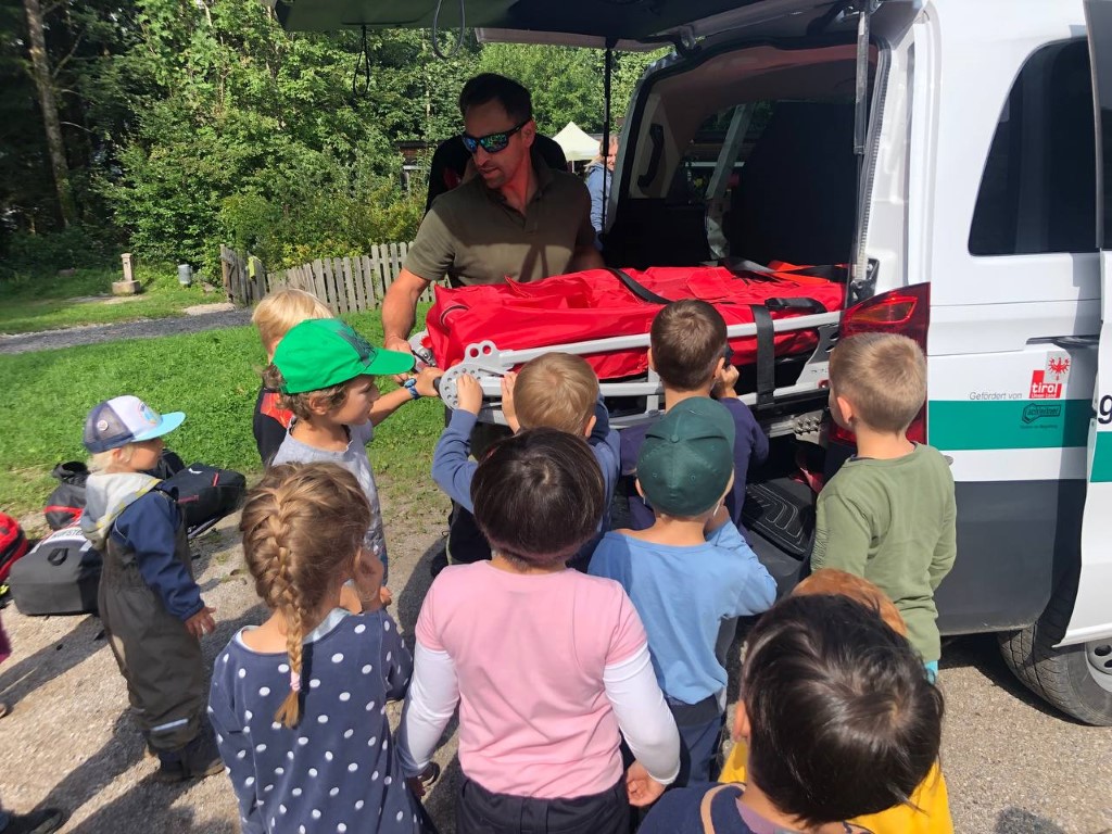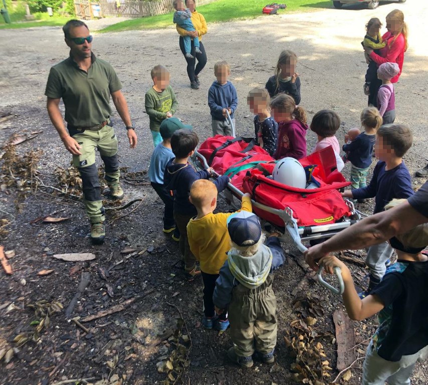 Für großes Interesse sorgten Ausrüstung und Aufgaben der Bergrettung bei den Kindern der Gruppe Wurzelzwerge im Waldkindergarten in Kufstein. Selbst die Kleinsten zeigten vollen Einsatz und packten tatkräftig mit an.
