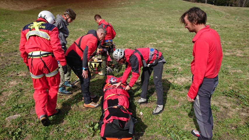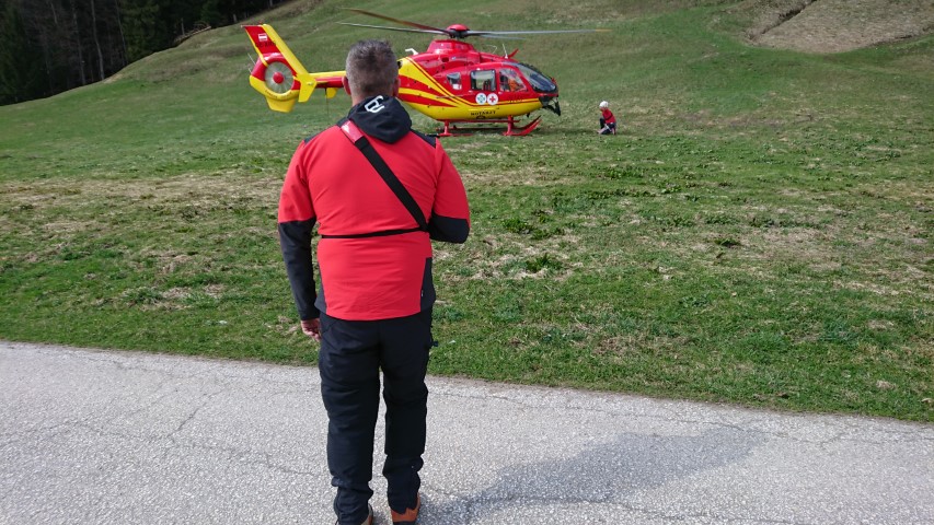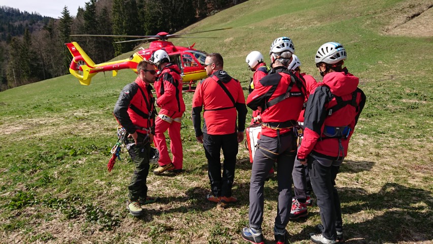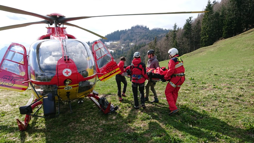 So kam man überein, dass ein Transport in der Gebirgstrage für die Patientin zu beschwerlich sein würde. Ein Notarzthubschrauber wurde beigezogen und flog die Dame trotz lebendigen Föhnwindes am Tau vom Unfallort bis zur Mannschaft der Bergrettung, die die Hubschrauberbesatzung bei der Umlagerung der Patientin unterstützte.